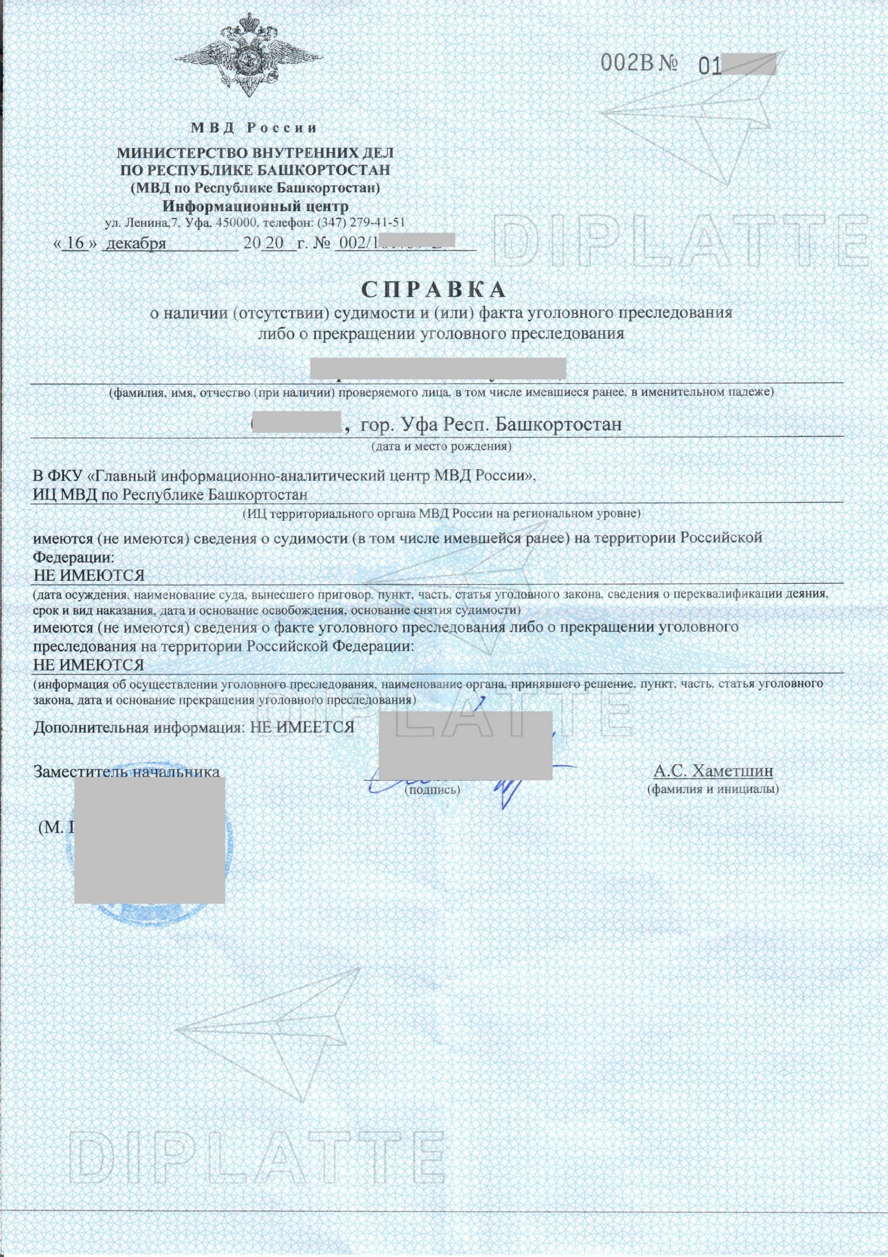 В этом случае вы можете выслать скан или фото в хорошем разрешении нам. Мы изготовим с вашего образца такую же справку с точно такими же номерами, но без судимостей — «чистую».