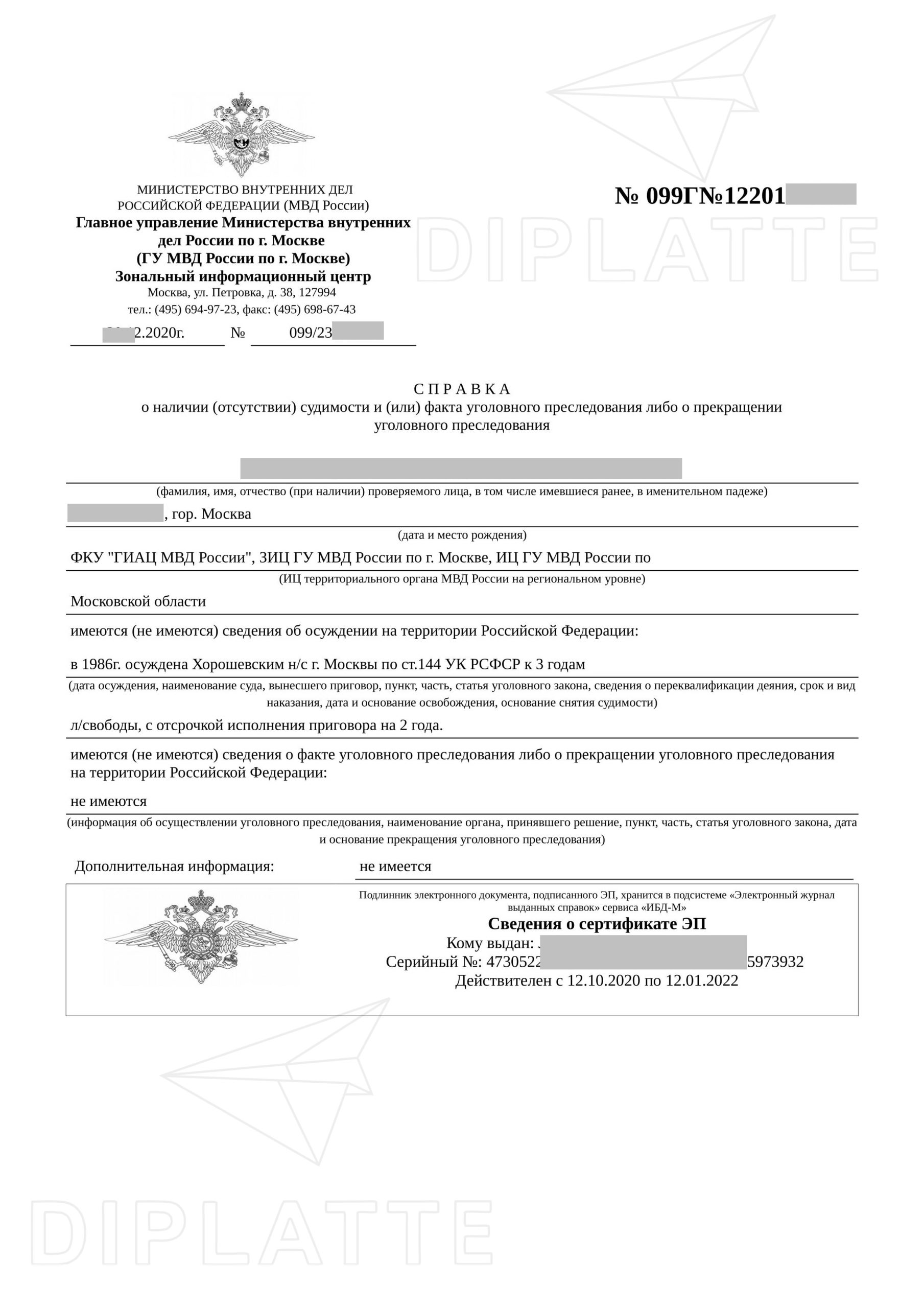 Справку о несудимости через официальные органы вы будете делать от 14 дней. Покупка через Диплатте займёт намного меньше времени. Если вам нужен только электронный вариант — в формате pdf (как выдаётся на Госуслугах), то 1 рабочий день. Но если вам нужен бумажный вариант, то нужно прибавить время доставки.
